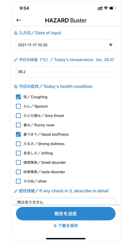 人数が多くなってしまうと確認も大変になりますが、HAZARD Busterでは、アプリから管理者側に送りたい報告の内容を必要に合わせて作成いただけ、送信された情報は管理者に集約されるので日々の体調確認を簡単に行えます。